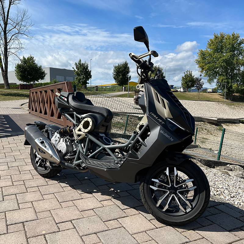 Vožnja Italjet Dragster 200 skutera bila je pravo osvježenje. Ovaj mališan odmah privlači poglede svojim upečatljivim i agresivnim izgledom, zbog kojeg se izdvaja iz mase. S njegovim oštrim linijama, zlatno-sivim detaljima i futurističkim dizajnom, svaki trenutak na njemu je prava atrakcija, kao da svi žele vidjeti o čemu se radi. Testirani model bio je dio Limited Edition serije, što dodatno povećava ekskluzivnost. Zlatno-siva boja mu daje sofisticiran i premium izgled, posebno u kombinaciji s njegovim futurističkim okvirima i otvorenim elementima konstrukcije. Ova boja savršeno ističe detalje poput ovjesa i kotača, čineći ga još privlačnijim i posebnim na cesti.